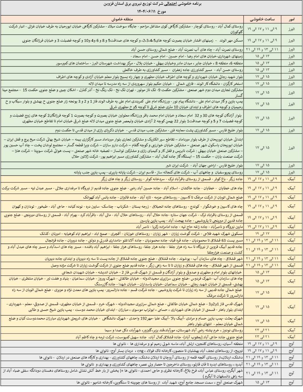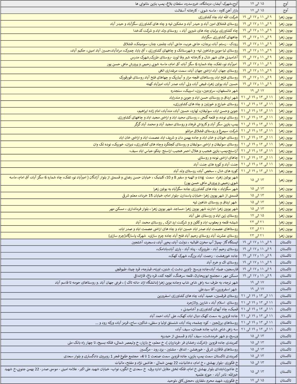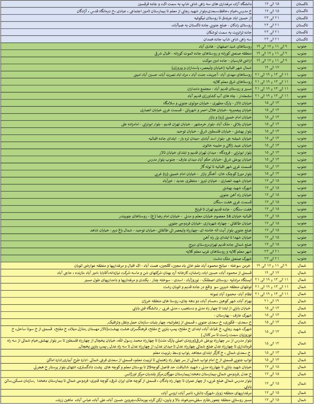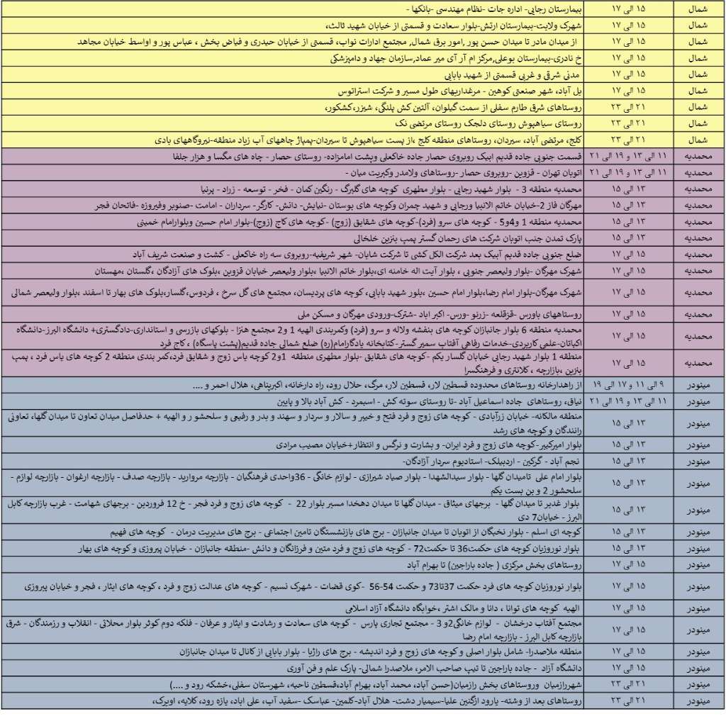 با توجه به افزایش شدید مصرف انرژی در کشور و بهمنظور جلوگیری از بروز چالشهای جدی انرژی، برنامه زمانبندی خاموشی احتمالی سهشنبه 11 شهریورماه 1404 به ترتیب زیر است:
